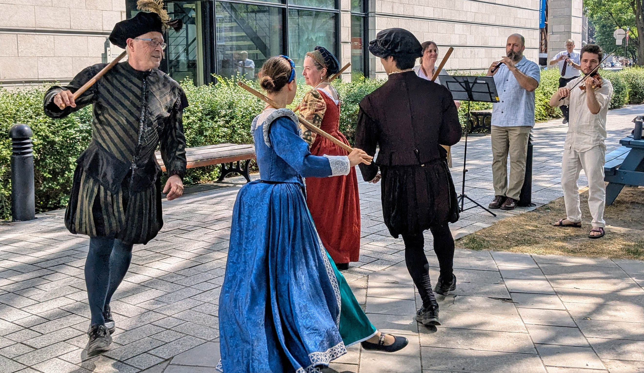 La Danse des Bouffons (Danse des épées), présentée par Danse Cadence devant le Musée Pointe-à-Callière le 10 août 2025. De gauche à droite : Pierre Charrand, Rosalie Chartrand, Shô Araki, Anne-Marie Gardette.